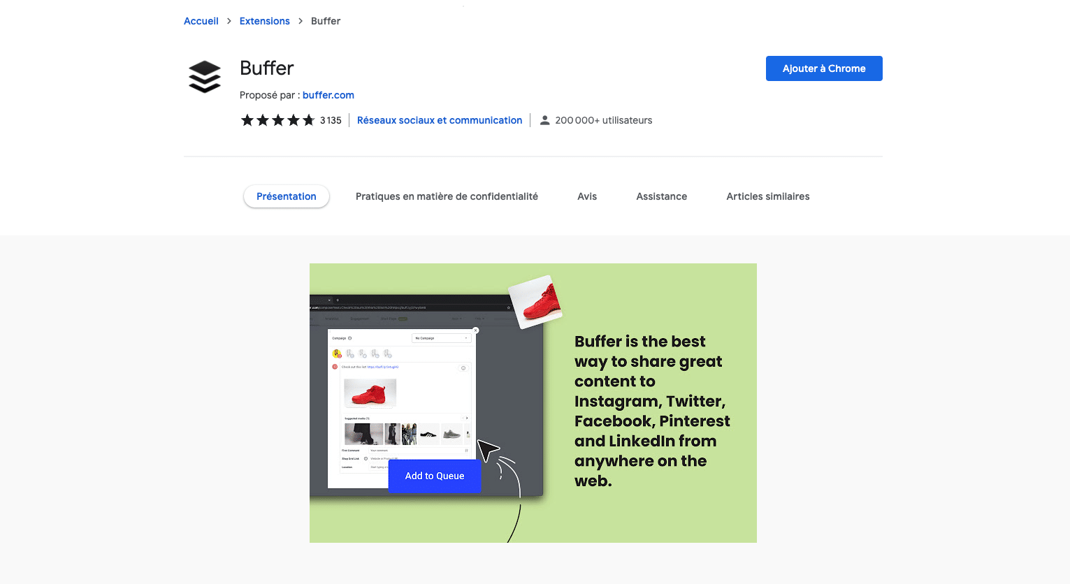 Buffer vous permet de partager sur vos réseaux sociaux du contenu depuis n’importe quel autre site web. L’extension vous permet de le faire directement dans votre navigateur sans avoir à passer par le site internet de Buffer.