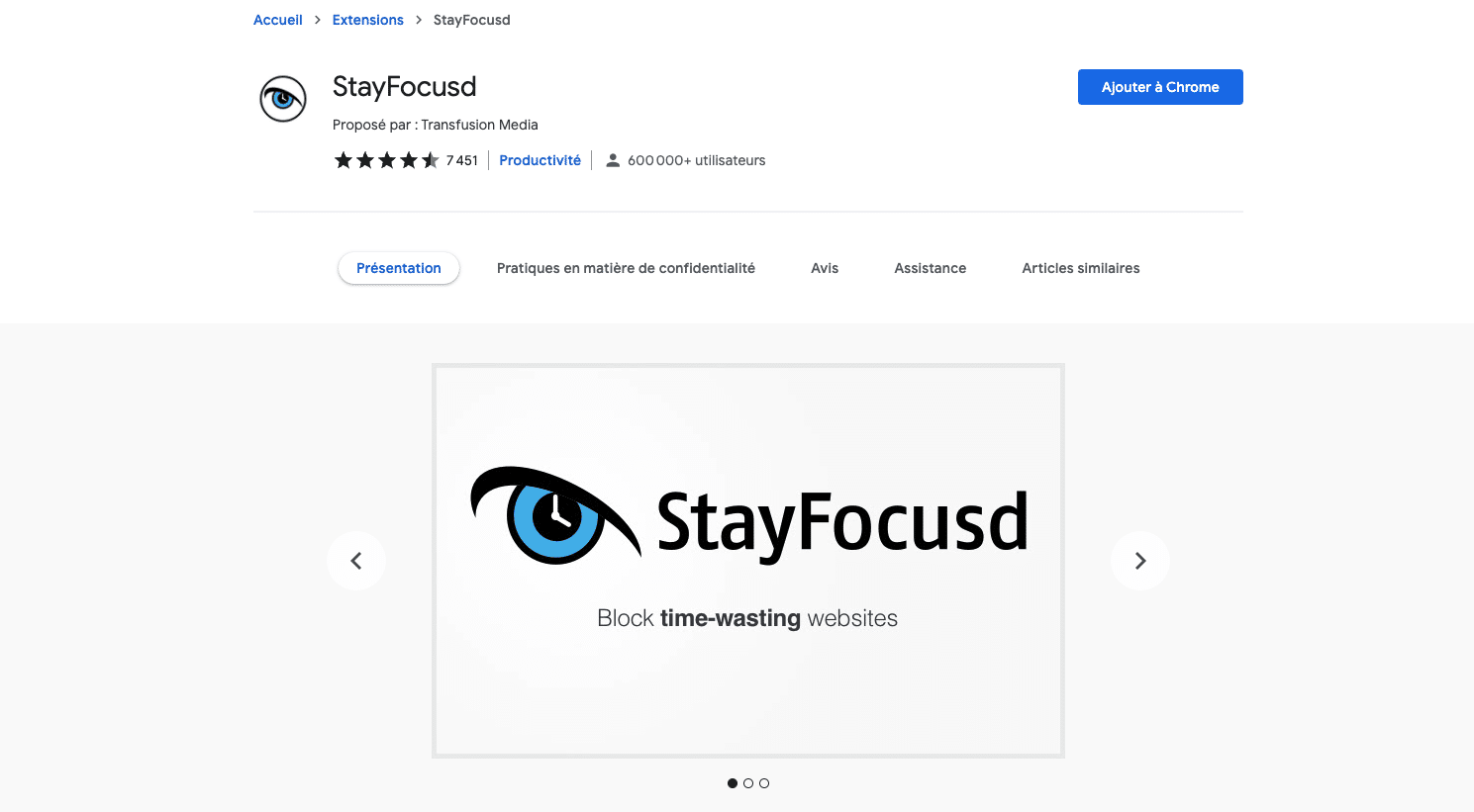 Définissez votre temps maximal d’utilisation d’un site, lorsque la limite est atteinte alors le site est bloqué pour la journée. Du site entier, des sous-domaines ou des pages ou même des contenus précis, StayFocusd est flexible.
