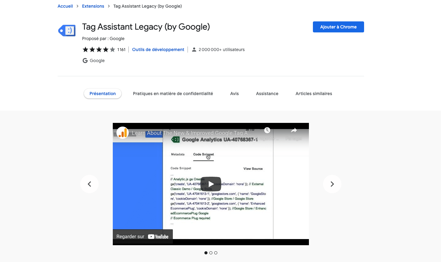 Tag Assistant Legacy est un plugin réalisé par Google qui vous permet en un clic de vérifier la liste des tags Google qui se chargent sur une page web.