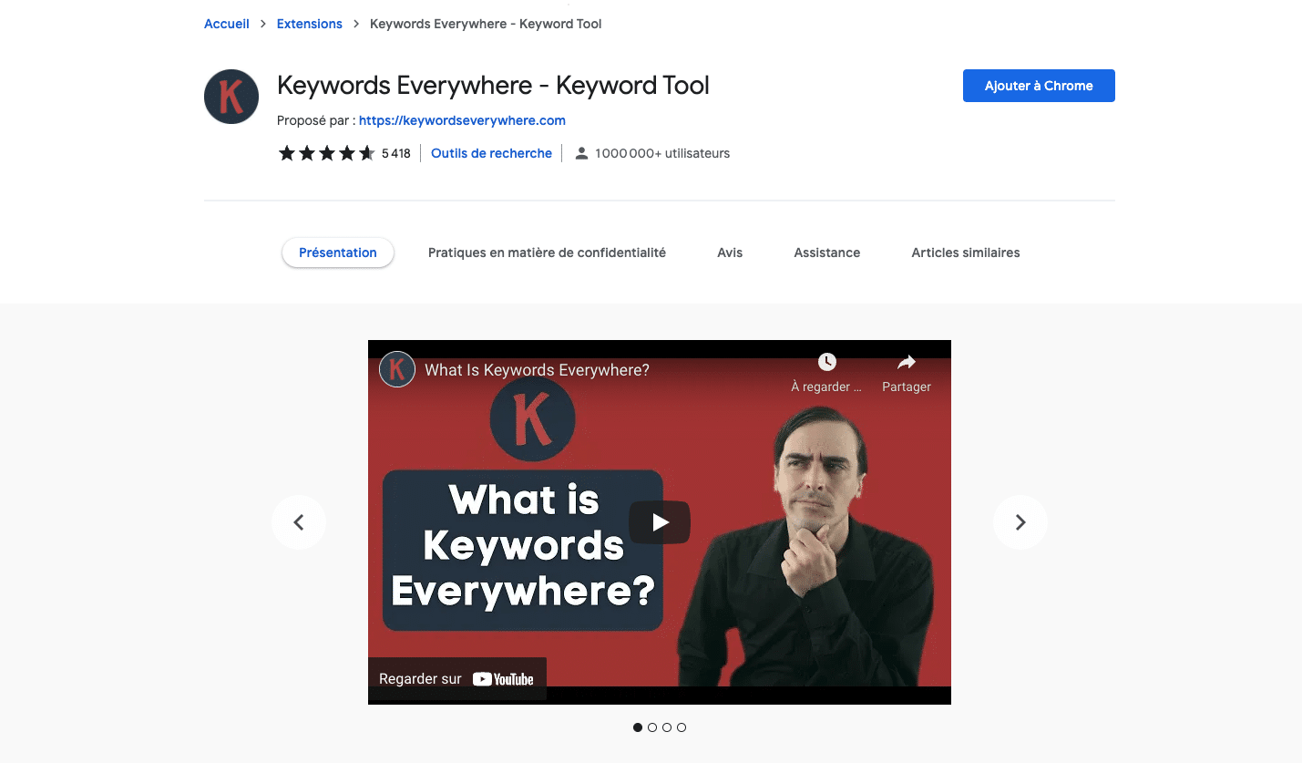 Keywords Everywhere est l’extensions idéale pour le SEO. Elle affiche les mots-clés associés à votre recherche et d’autres termes de recherches associés sur Google.