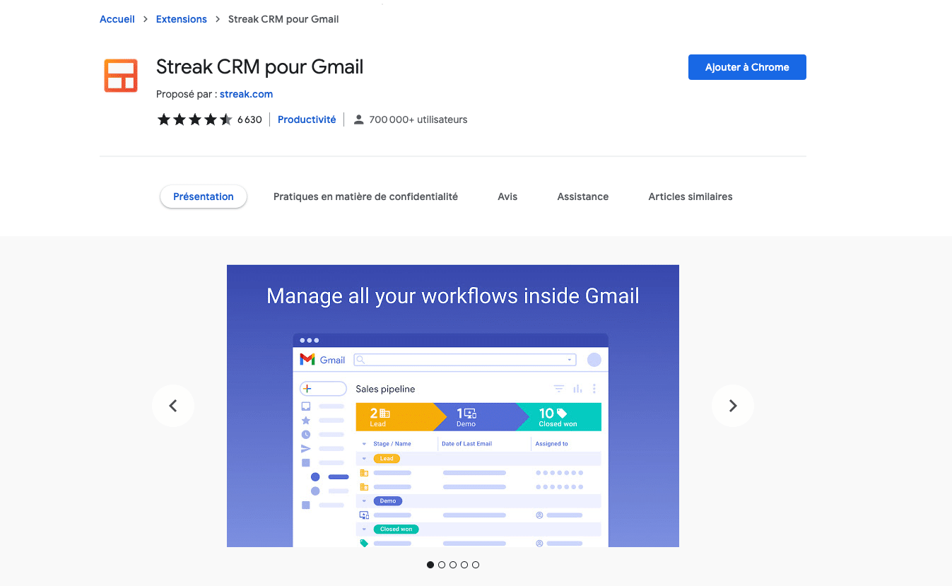 L’extension vous permet de gérer vos clients et de suivre vos ventes directement depuis votre boîte mail.