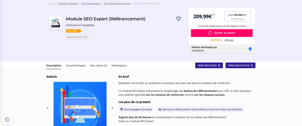 Le module SEO Expert améliore la position de votre boutique en ligne dans les moteurs de recherches. Il permet d’augmenter votre trafic. Il offre aussi à votre e-commerce une meilleure visibilité sur le web comme sur les réseaux sociaux. Ce module permet un remplissage automatique des balises de référencement, un gain de temps énorme pour ce travail très minutieux.