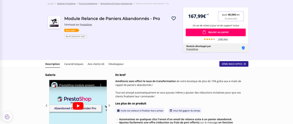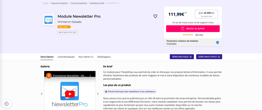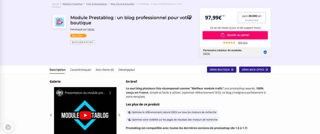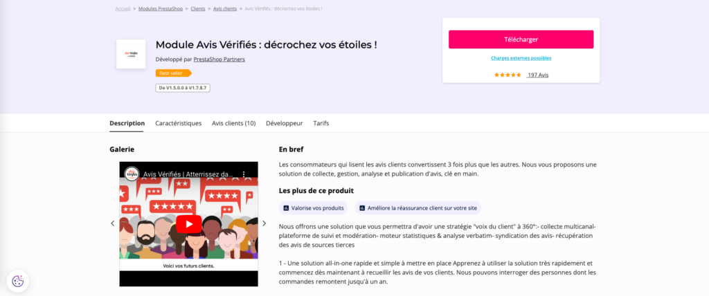 Tous les modules PrestaShop existants se trouvent sur Addons PrestaShop. Vous aurez accès à toutes les extensions proposées par le CMS. Chacune détienne une fiche explicative qui vous permettra de faire votre choix.