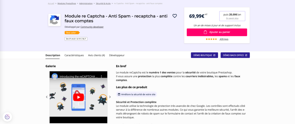 Le module Recaptcha – Anti Spam est le n°1 des ventes en termes de sécurité d’une boutique PrestaShop. Il assure une protection optimale et complète contre les spams, les faux comptes et les courriers indésirables.