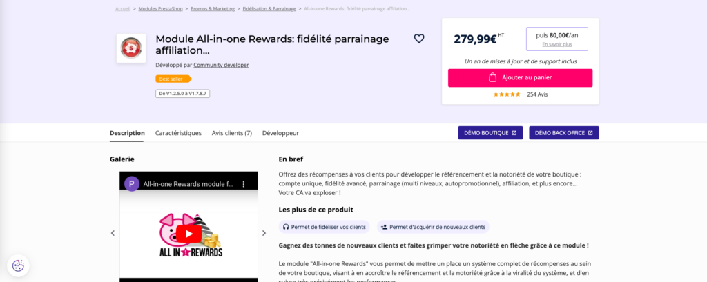 Le module All-in-one rewards : fidélité parrainage affiliation FB développe la notoriété et le référencement de votre boutique en ligne. Vous récompensez vos clients : compte unique, parrainage, fidélité avancée, etc. Vous allez voir votre CA augmenter considérablement.Les plus :