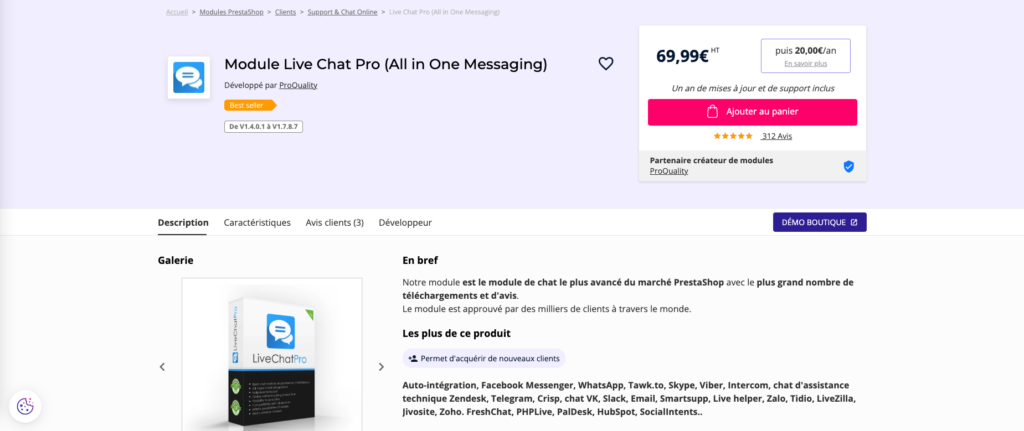 Le module Live Chat Pro est approuvé par des milliers de clients dans le monde entier. C’est le chat le plus performant de PrestaShop. Il détient le plus grand nombre de téléchargement et d’avis. Il permet l’intégration de toutes les messageries les plus connues : Messenger, Whatsapp, Telegram, Skype, etc. Vos clients ont accès à un service d’assistance de haute qualité.