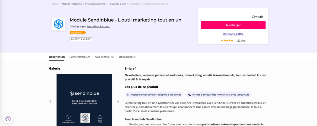 Le module Sendinblue est un outil marketing tout en un. Il vous permet d’envoyer des newsletters, des mails transactionnels, des relances paniers abandonnés, des emails marketing personnalisés, etc. Tout est inclus dans ce module unique, français et gratuit.